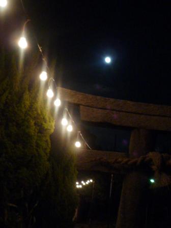 鳥居の上に お月さん 風に揺れる白熱灯とのコラボ(^^)