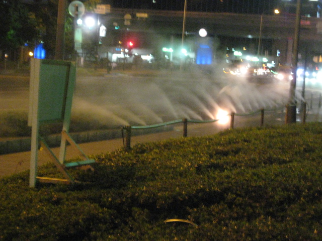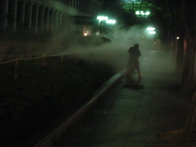 今日は阿倍野の児童画教室が終わってから 梅田に出ました。 友達といろいろ長話 すでに日は落ち、歩いて淀屋橋へ 大阪市庁の前に ニュースで見た 霧吹き!? 涼しい?というより 雨に濡れたような感じ 自転車で通り過ぎる人 急いで通り過ぎる人とt 止まって浴びる人? 対象的でした。 こんなサービス 夜もやってるんですね。 経費削減 が叫ばれる中 ちょっと ほっとできました(^^)