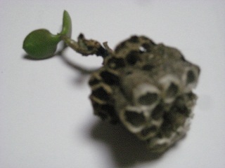 今日は日曜日 N響アワー(nhk教育21:00~22:00)に間に合うように帰宅 食卓に座って びっくり なんじゃ これ? 母が洗濯物を干している時に 植木鉢から見つけたそうです。 成金草の枝に 蜂の巣 蜂の巣に金成木? 枝に巣を作ってて 枝が落ちた?ようですね。 葉は生きてます!