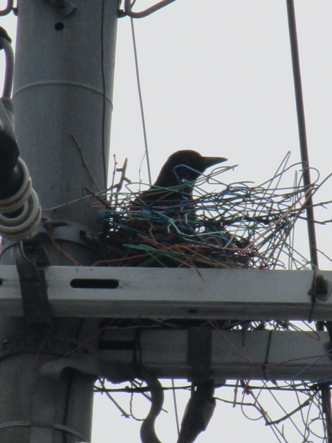 烏が 棒ハンガーで 巣を作っています。