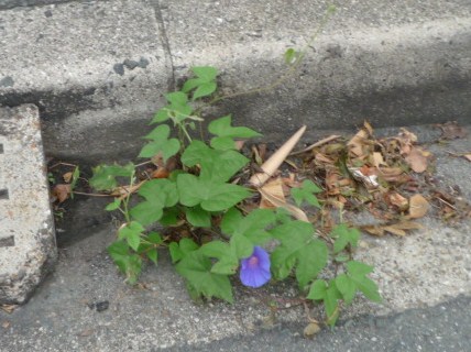 アスファルトの割れ目から 朝顔が伸びて 咲いています。
