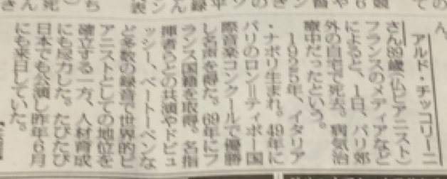 ビアニストのチッコリーニさんの訃報も載ってました。